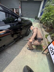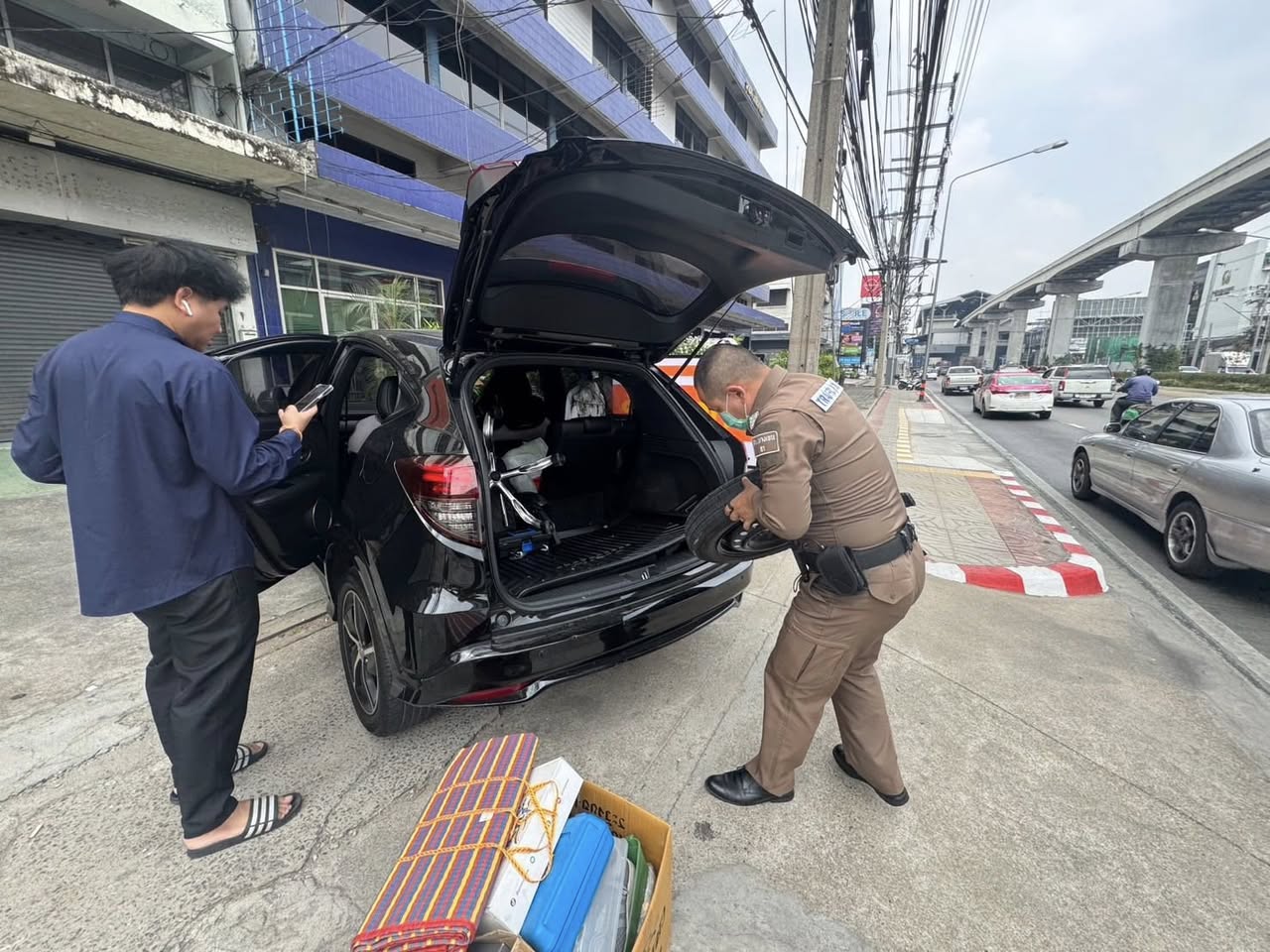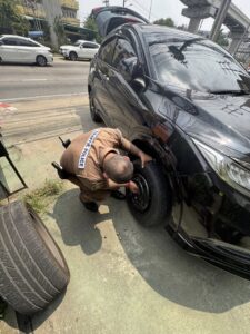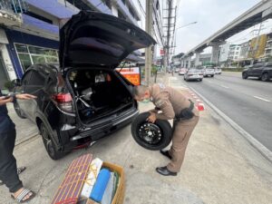 พ.ต.ท.ธีระ หล้านามวงศ์ สว.จร.สน.บางเขน ให้การช่วยเหลือรถนั่งส่วนบุคคล ยางล้อหน้าแบน ดำเนินช่วยเหลือ เข็นเข้าที่ปลอดภัย เปลี่ยนยางอะไหล่ สามารถเดินทางต่อได้เรียบร้อย พ้นกีดขวาง บริเวณถนนรามอินทรา กม.4