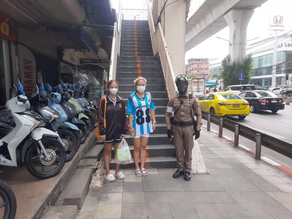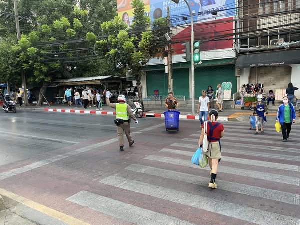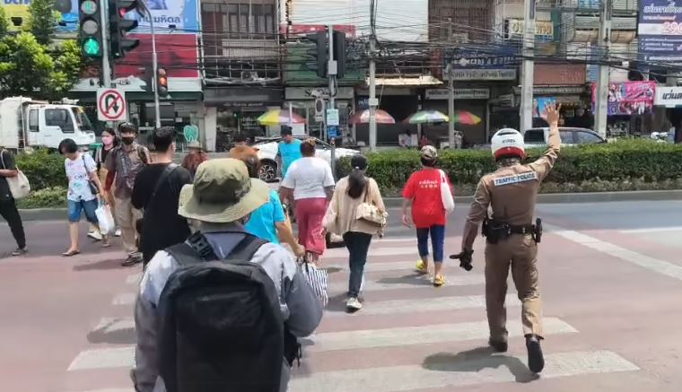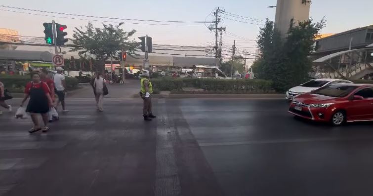 เจ้าหน้าที่ตำรวจจราจร สน.บางเขน อำนวยการจราจร ไฟแดงคนข้ามทางม้าลาย บริเวณหน้าตลาดยิ่งเจริญ เพื่อป้องกันการเกิดอุบัติเหตุบนท้องถนน