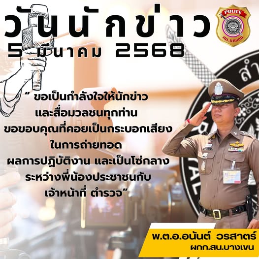 สน.บางเขน นำโดย พ.ต.อ.อนันต์ วรสาตร์ ผกก.สน.บางเขน “ ขอเป็นกำลังใจให้นักข่าว และสื่อมวลชนทุกท่าน ขอขอบคุณที่คอยเป็นกระบอกเสียง ในการถ่ายทอด ผลการปฏิบัติงาน และเป็นโซ่กลางระหว่างพี่น้องประชาชนกับ เจ้าหน้าที่ ตำรวจ ”
